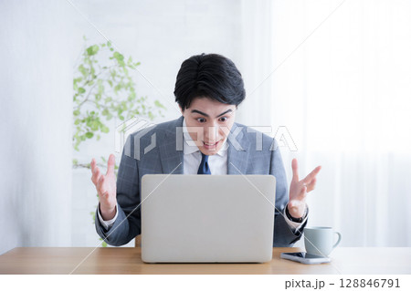 パソコンの前で仕事のお手上げポーズ もう仕事やってられない!信じられない
