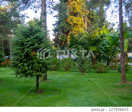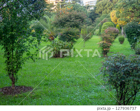 Bushes in the park. Well-groomed park area. Quiet place in the city.