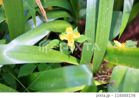 緑の葉の中に黄色い花びらのやまぶきそうの花が2輪咲いている風景