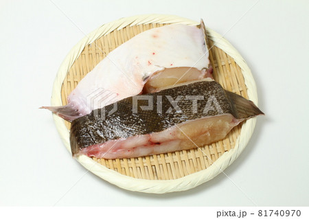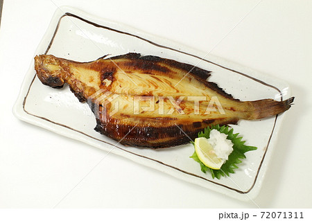 焼き魚、こんがり焼かれたなめたカレイの干物、白バック