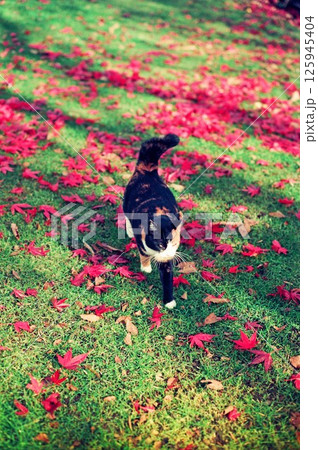 芝生に落ちた紅葉の上を歩く三毛猫、チャコちゃん