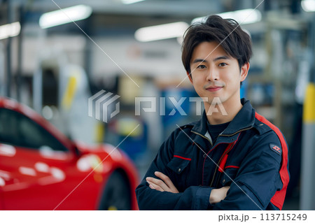 車の前で腕組みする作業着を着たミドルの自動車整備士の男性