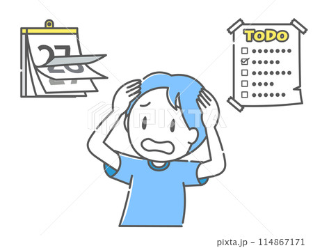 カレンダーとToDoリストを見て頭をかかえる人(背景なし)