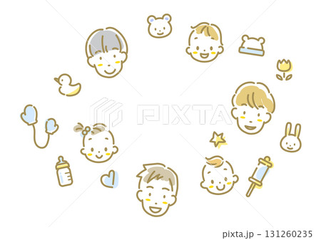 赤ちゃんとお父さんとあしらいのフレーム 手描き水彩風のお洒落でかわいい線画イラスト