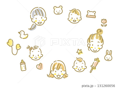 赤ちゃんとお母さんとあしらいのフレーム 手描き水彩風のお洒落でかわいい線画イラスト