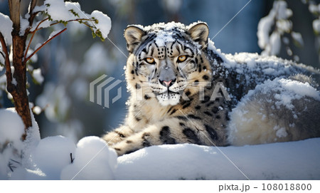 Majestic snow leopard resting on a snowy landscape with a soft blue background in a serene moment of nature