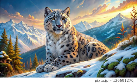 Majestic Snow Leopard in a Vibrant Mountain Landscape Artwork Illustration