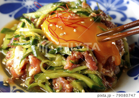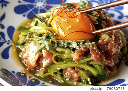 糸唐辛子やいり胡麻が乗っている胡瓜と生ハムのユッケの上の卵黄を割って食べる