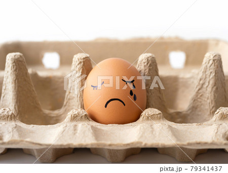 Sad crying brown Egg in paper carton box. Creative emotion face character shell painted isolated on white background.