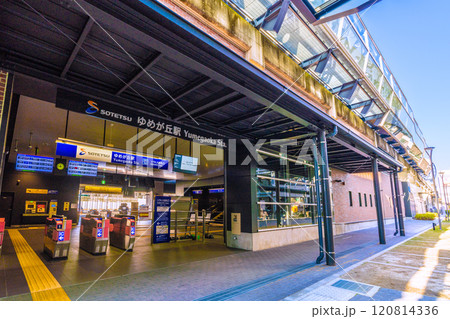 日本の横浜都市景観 SOTETSU ゆめが丘駅や電車、ゆめが丘ソラトス(左)などを望む