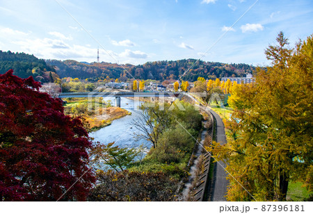 杜の都仙台 晩秋 広瀬川 米ヶ袋スポーツ公園から愛宕大橋とビル群