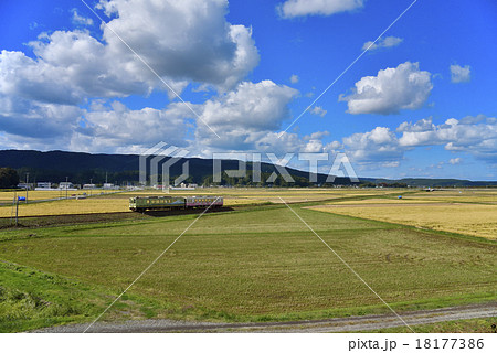 由利高原鉄道の列車は、稲刈りが始まった田園地帯を走り抜ける