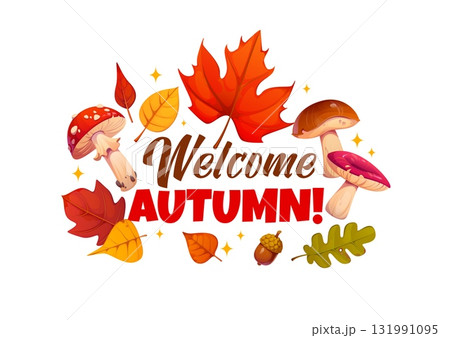 Welcome autumn quote banner with fall season leaves and mushrooms. Cheerful autumnal phrase surrounded by colorful seasonal leaves, acorns and mushrooms. Vector festive message celebrates fall season