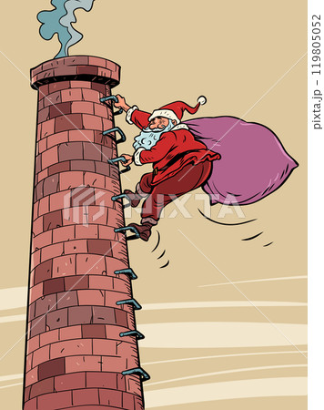 Santa Claus climbs up the chimney. The coming holiday is New Year. The symbol of winter brings gifts.