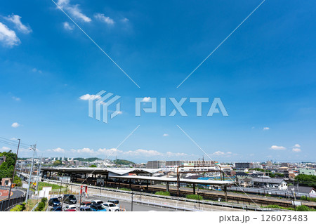 よみうりV通りから京王よみうりランド駅と稲城市の眺め 春の青空 東京都稲城市矢野口
