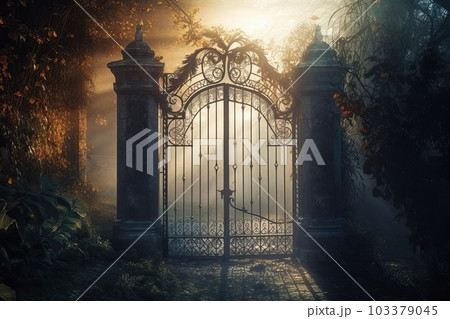 A large wrought-iron gate to the garden, the park in an eerie fog, generative AI.