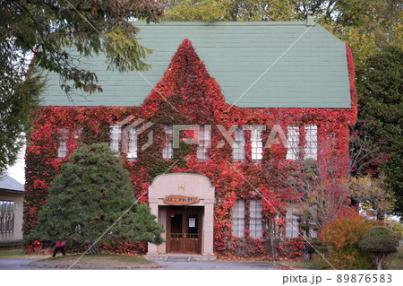 赤く染まったツタの絡まる洋館 りんご史料館(青森県黒石市)
