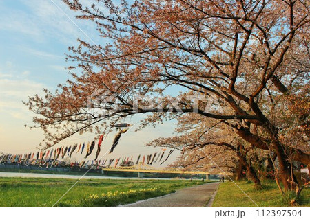 岩手北上展勝地の桜と鯉のぼりが幻想的な夕暮れ