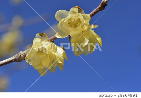 春を感じさせる真冬に咲くロウバイ 青空を背景に