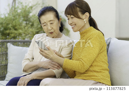 ソファに座ってスマホを見ながら会話するシニア女性とミドルエイジの親子