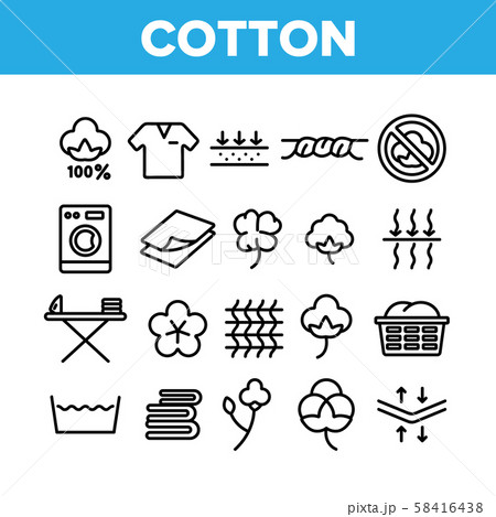 Cotton icons. Collection symbol of natural certified producing of clothes. Line art style sign or badges for natural fabric. Hand-drawn illustration isolated on white background