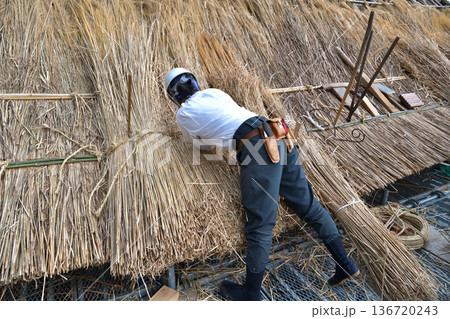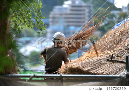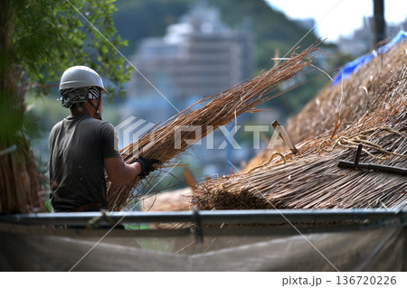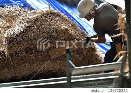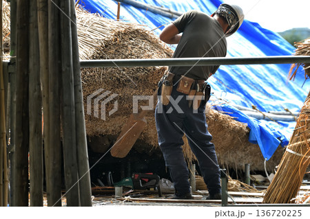 茅葺屋根の葺き替え工事 茅葺職人の作業風景