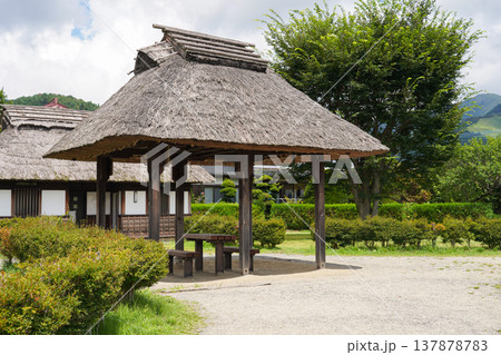 忍野八海、茅葺き屋根の東屋と日本の原風景