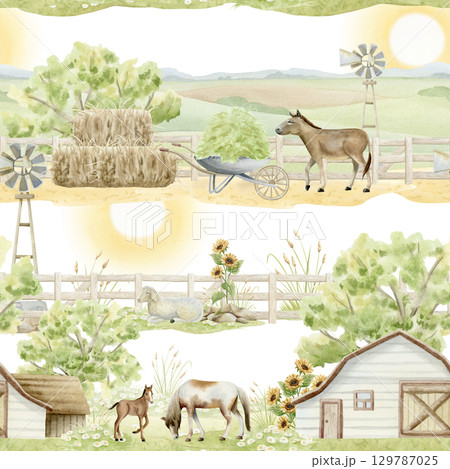 Farm landscape seamless pattern with horses and donkeys on white. Watercolor ranch animals with barn, green fields, hay stacks, wooden fence and windmills illustration. Countryside nature background