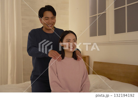 寝室で妻の肩揉みをする夫