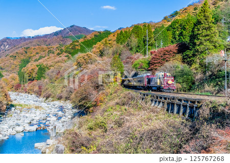わたらせ渓谷鐵道 紅葉のわたらせ渓谷を走るトロッコわたらせ渓谷号(沢入付近)