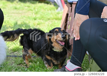 ドッグランで遊ぶ犬たち (ミニシュナ・ダックス)