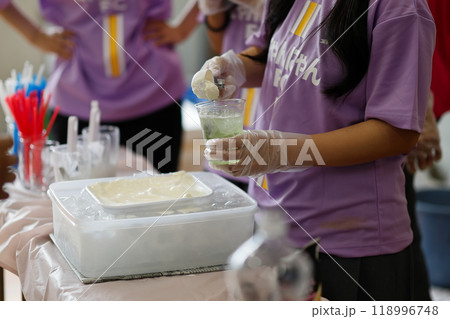 Cup of scoop coconut flavor ice cream and fresh matcha tea, green tea on wooden table.