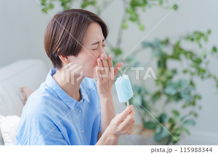 アイスを食べる女性 頭痛 頭を抱える