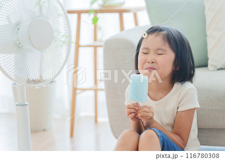 夏休みに扇風機の前でアイスを食べる子供