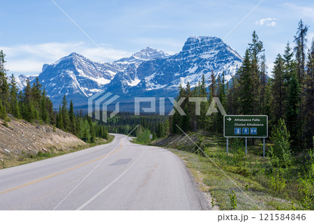 Road sign to Athabasca Falls on Icefields Parkway (Alberta Highway 93) in Jasper National Park, Alberta, Canada. Canadian Rockies summer landscape. Mount Fryatt and Geraldine Peak in the background.