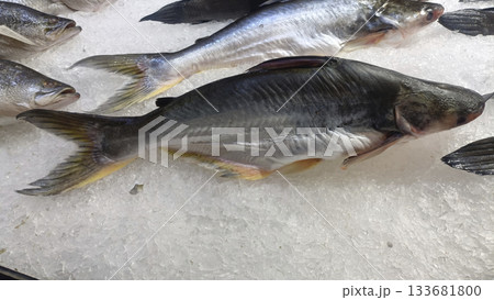 Fresh whole fish on crushed ice display with subtle yellow fins and silver scales conveying market freshness