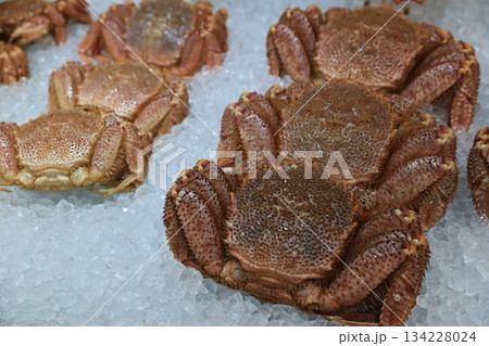 Array of fresh seafood, with glistening live crabs, prawns and a pile of shellfish on ice cubes, evokes the vibrant essence of ocean bounty. Perfect for culinary enthusiasts and seafood market