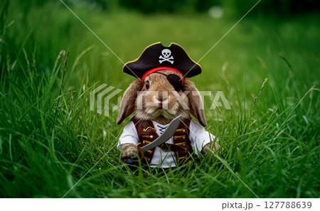 草原の中にいた海賊姿のウサギ