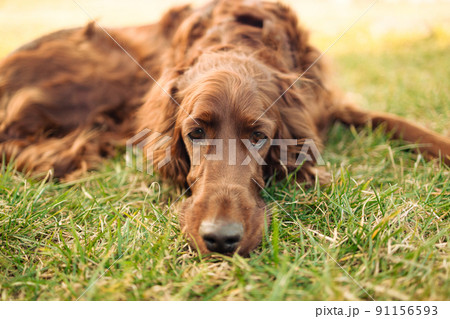 Irish red setter dog resting on green grass background at summer time, outdoors
