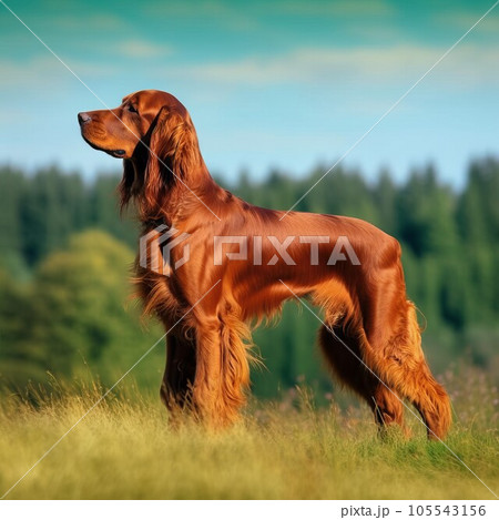Irish Setter dog standing on the green meadow in a summer green field. Portrait of an Irish Setter dog standing on the grass with a summer landscape in the background. AI generated illustration.