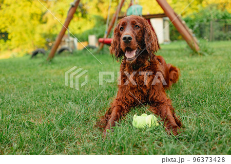 Beautiful Irish setter resting in the garden during summer. Brown dog breed Irish setter with his tongue hanging out outdoors in the park. Full body