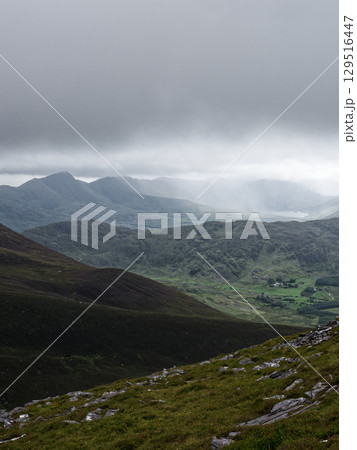 The view shows the overcast day. Jagged green mountains ascend into the misty sky, creating a scenic vista in County Kerry, Ireland.