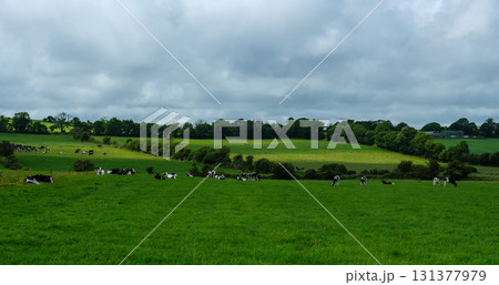 A large herd of black and white dairy cows are peacefully grazing and resting in a vibrant green pasture in the rolling hills of West Cork, Ireland.