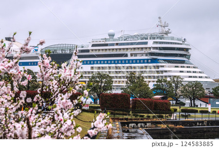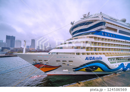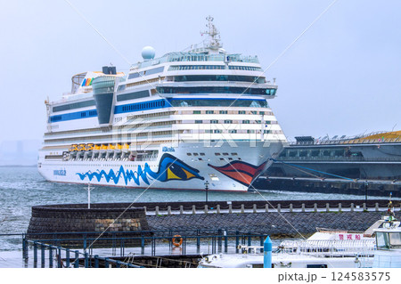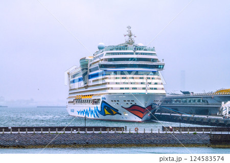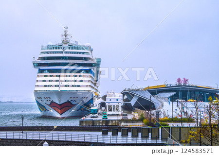 日本の横浜都市景観初入港したアイーダ・ステラが大さん橋に停泊中…雨。冬の寒さに逆戻り…=4月1日