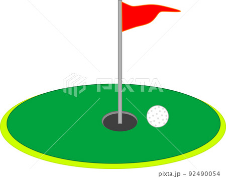 ゴルフのイラスト。ゴルフ旗を持ってる女性。パターでゴルフボールを打とうとする男性。