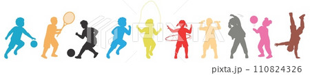 Happy sports children playing games colorful silhouette isolated set