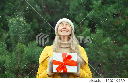 Happy smiling woman holding red gift box on Christmas tree background in winter forest