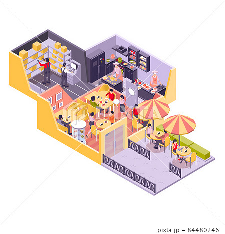 Isometric cafe interior. Open kitchen restaurant or pizzeria. People meeting, drinking and eating. Waiters delivering food flawless vector scene