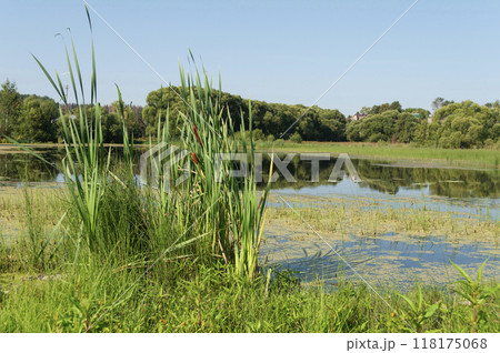 Beautiful summer countryside landscape with river overgrown with duckweed