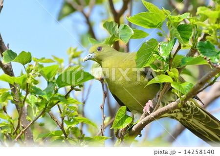 自然 植物 ズアカアオバト、石垣島の森の中、緑色の体が新緑に溶け込んでいます